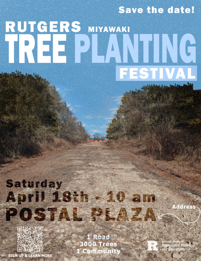 Please join us on April 18, 2026 for the Rutgers Tree Planting Festival, where we will be planting 3000 trees in the footprint of an abandoned roadway that was removed last year by Rutgers Institutional Planning and Operations.